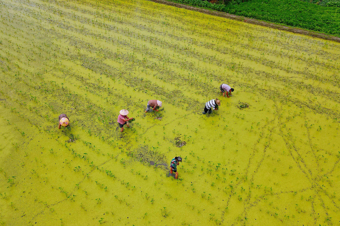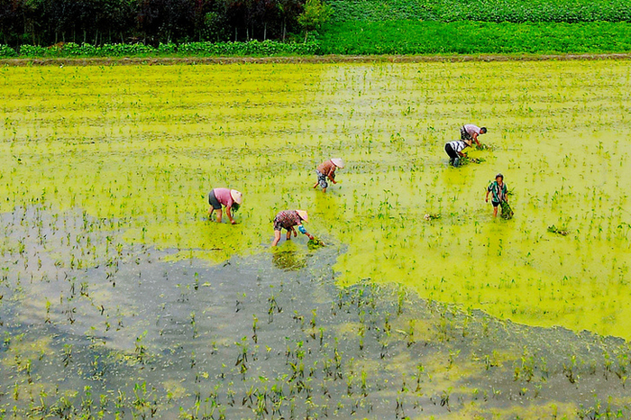 Фермеры усердно трудятся в рисовом поле в уезде Жугао городского округа Наньтун. Работать им приходится почти по колено в воде.