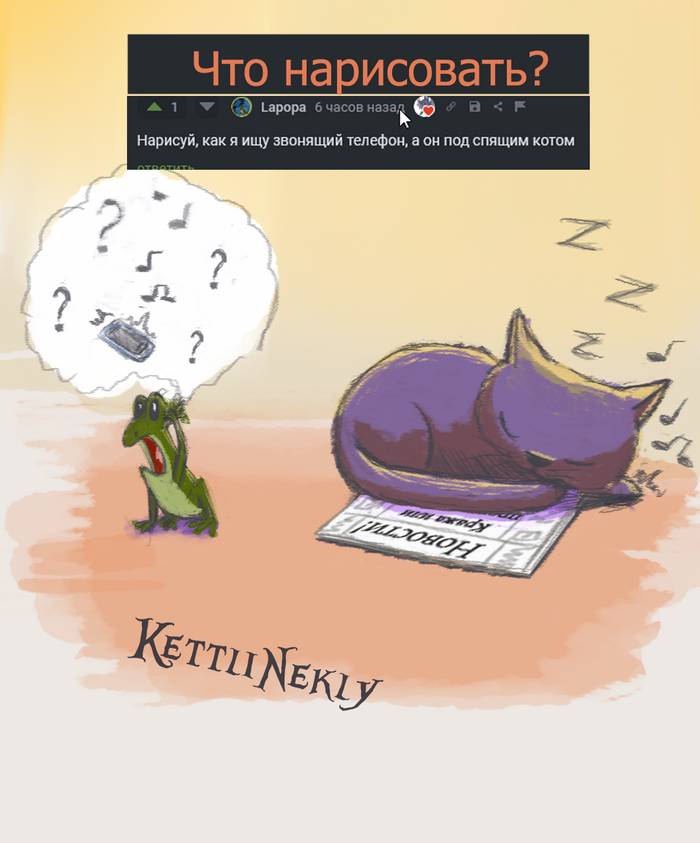 Нарисуй, как я ищу звонящий телефон, а он под спящим котом.