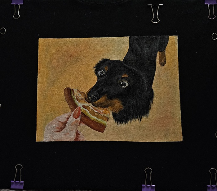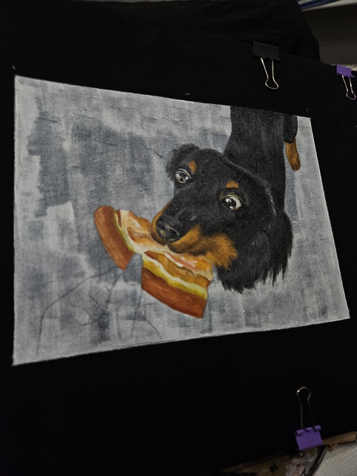 Занимаюсь росписью специальным акрилом по ткани. Вот такой пёсель получился, рисовала с фотографии, пёсик знакомой.