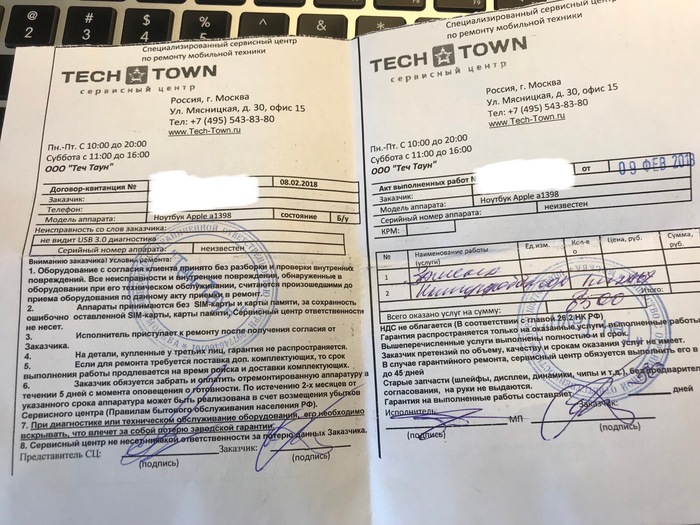 итог. имеем макбук, который мы сдаем в течтаун. макбук, который необходимо а)разобрать, б)нажать пальцем на нужный шлейф, в)взять за это любую пришедшую в голову сумму, адекватную получасу работы специалиста. в течтауне вместо этого нам снимают рабочую деталь, ставят НЕрабочую, берут за это 8500 рублей и не хотят отдавать снятую деталь и оформленные документы о ремонте.