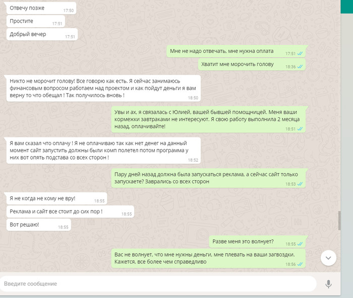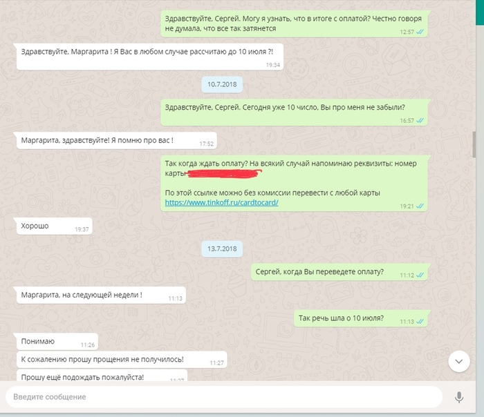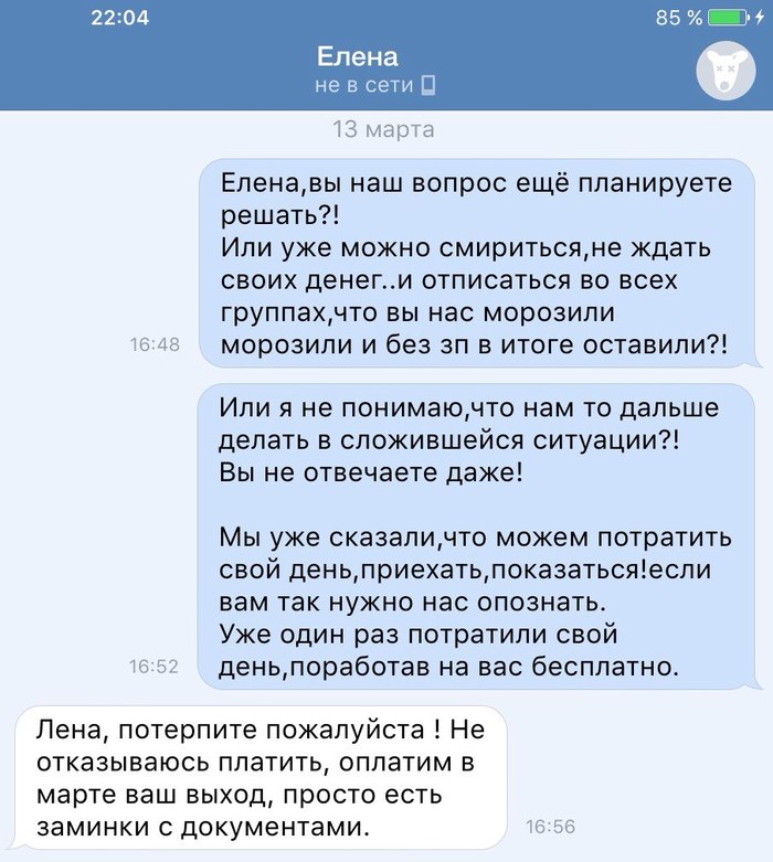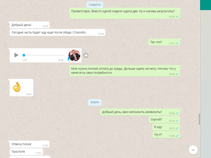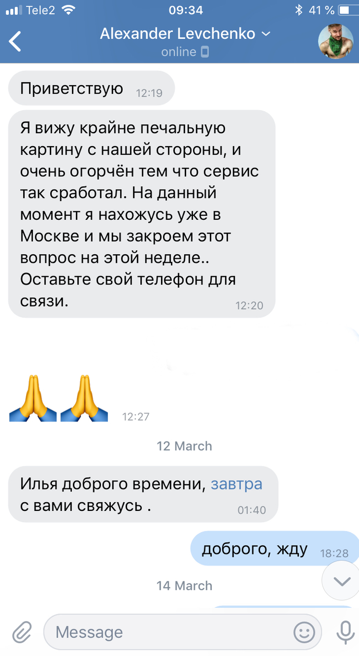 далее я нашел вконтакте страницу непосредственно мастера левченко, и написал уже ему. мастер левченко мне ответил и клятвенно пообещал разобраться в течение, цитирую: «трех-четырех дней». была достигнута договоренность, что он вернет мне сумму за ремонт на карту, а я вышлю почтой поставленную ими плату. далее он примерно раз в неделю обновлял свои обещания, потом несколько раз звонил с обьяснением причин, почему он не может отправил деньги прямо сейчас. сервис мол переезжает, времени и денег нет, и вообще наши проблемы - ерунда в масштабах вселенной. подожди, мил друг, еще недельку. спустя месяц с хвостиком мне упали на карту 4500, после чего александр на связь выходить перестал.