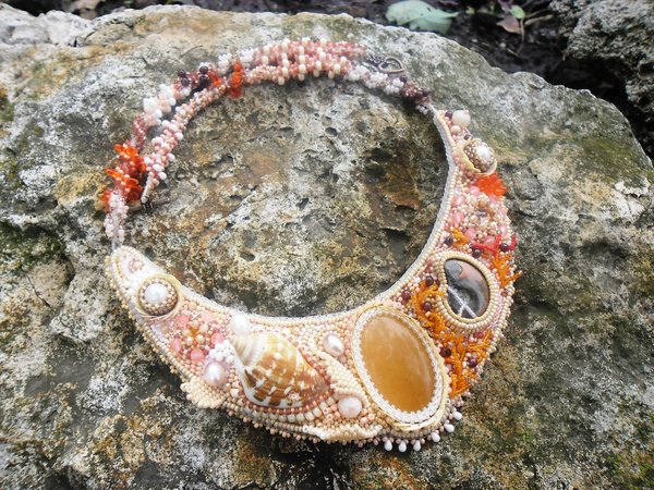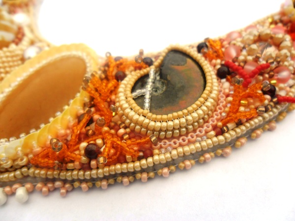 Колье в теплых цветах и оттенках. Одно из самых сложных моих украшений, хотя и небольшое. Делала для конкурса "Волшебство подводного мира". К сожалению, на конкурс можно было послать лишь одно фото целого украшения, фотка не самая удачная, да еще и растянута на страничке для голосования. А красота этого колье именно в деталях. Не дотягиваю к конкурсам, короче, печаль-беда((