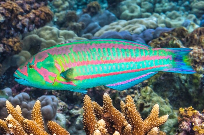 В отличие от остальных рыб в топе, вы вряд-ли когда-нибудь слышали об этом забияке. Зато бывалые дайверы при упоминании этой рыбы наверняка расскажут вам свою пару историй, связанных с этой рыбой. И не всегда истории будут с хорошим концом, скорее наоборот. Спинороги получили своё название благодаря второму спинному плавнику, который преобразовался в крупный шип с особым механизмом. В спокойном состоянии спинороги складывают шип в специальную выемку на спине, и его не видно, но стоит только спинорогу почувствовать опасноть - шип поднимается в вертикальное положение, причём особый механизм наглухо фиксирует его в таком положении. Сложить шип обратно без воли спинорога невозможно, только сломать. Шип спинороги используют для защиты от хищников. Если спинорог окажется во рту или в глотке своего обидчика, он немедленно включит свой механизм и застрянет так, что хищник попытается скорее избавиться от такого обеда. Однажды попробовав съесть спинорога, хищник сто раз подумает, прежде чем нападать на его сородичей. Так же спинороги применяют свой шип для того чтобы прочно зафиксироваться в выемках скал и кораллов, так они могут спокойно отдыхать или укрываться от хищников. Но шип с особым механизмом - далеко не единственная уникальная особенность спинорогов. Все спинороги имеют необычную форму тела, яркую окраску и очень буйный нрав. Если содержать спинорога в аквариуме, то он со стопроцентной вероятностью станет самым наглым задирой, будет отбирать у всех корм и отвоюет себе самое лучшее место.