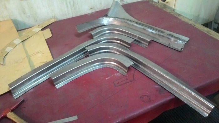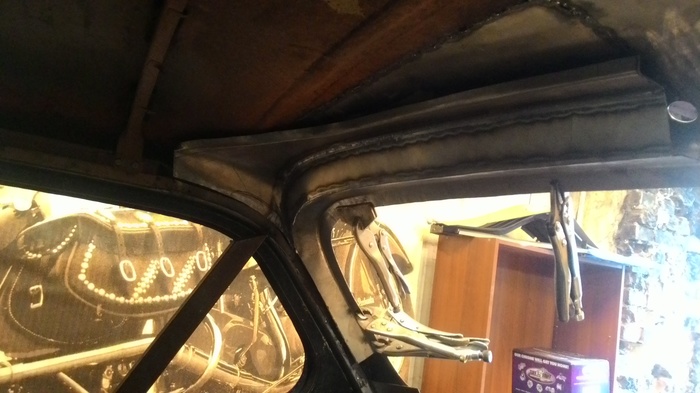 Далее пошли многочисленные примерки внешней накладки, а должен напомнить, что в салоне вварен крест и поддержка крыши, поэтому путь от примерки к верстаку и обратно был труден, опасен, и такая гимнастика к концу дня давала о себе знать. После этого еще пол дня на сборку,сварку и пол дня на зачистку. Это я к тому что для фото процесса вообще не было времени и сил, есть только итоговый результат: