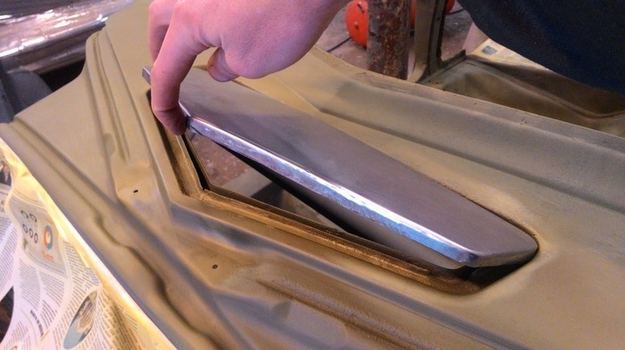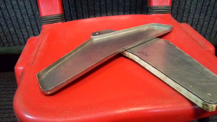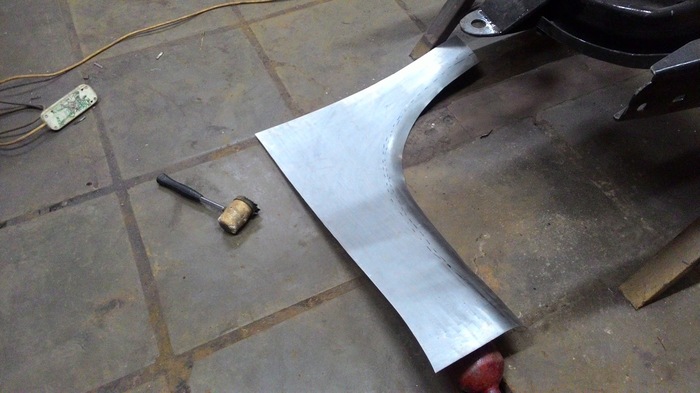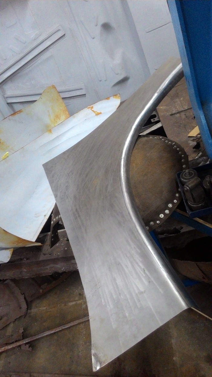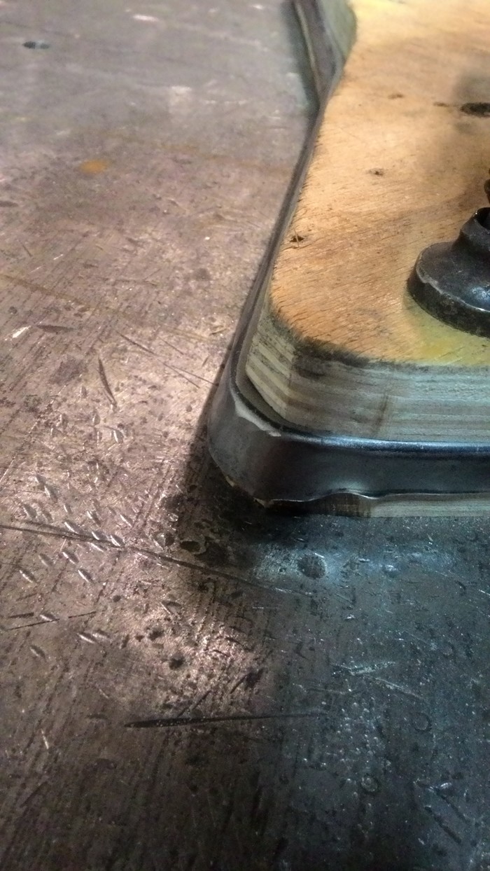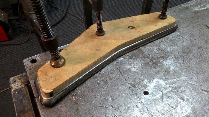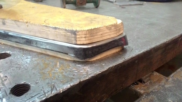 Благо дерево гибкое, и матрица изогнулась как мне надо. Таким образом я получу выстучанную плоскость из уже дугообразного металла. Так дуги обоих половинок дадут равномерный радиус как на оригинале.