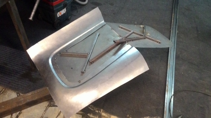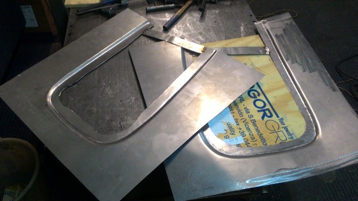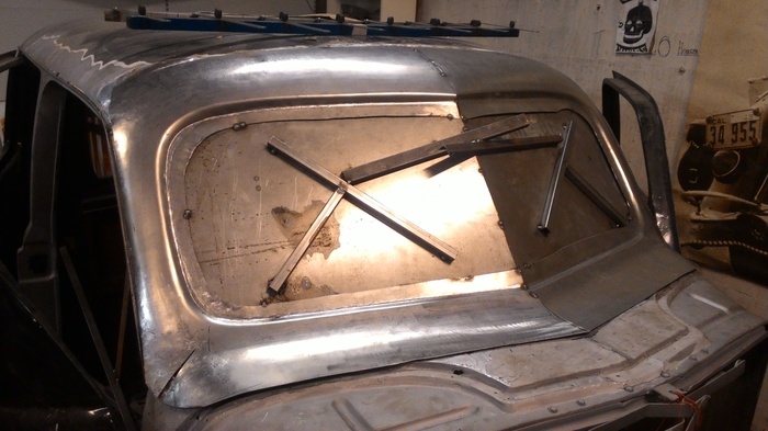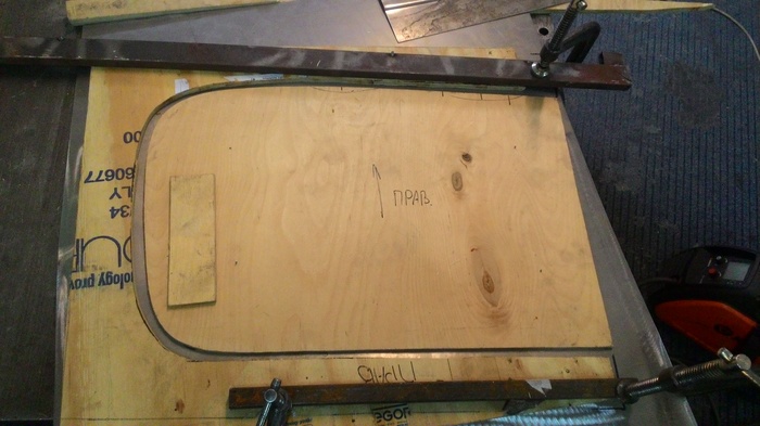 Здесь форма еще совсем приблизительная. В размерах только сам проем, дальше нужно примерять. При чем до этого я уже примерял пополовинно, но пришло время половинки соединить. здесь крайне важно сохранить плоскость каждого проема, а так же выставить идеальный угол между ними. Для этого из толстой стали вырезал "стекла", которые идеально садятся в оконную рамку. Если стекло на самом деле меньшего размера чем само окно, то здесь большего, что б прям легло туда, куда надо. Оба стекла между собой сварил. Для сохранения угла и плоскости прямо на машине обварил это дело профилями, пока конструкция не перестала играть и шататься. Получился некий кондуктор.