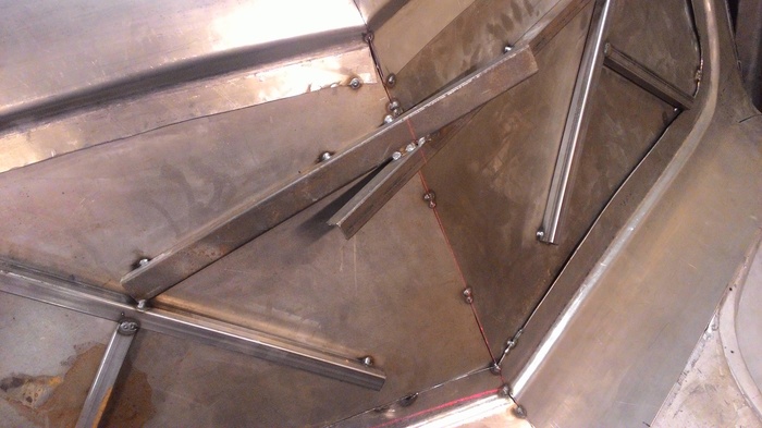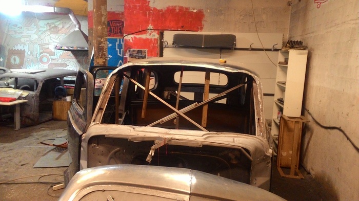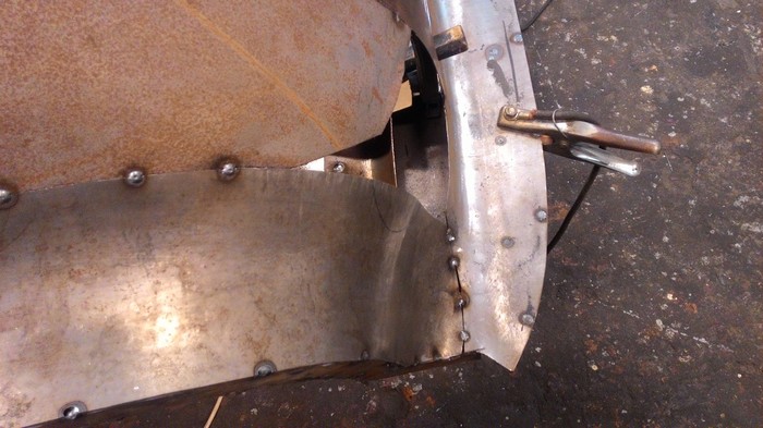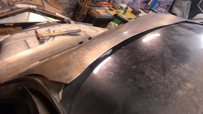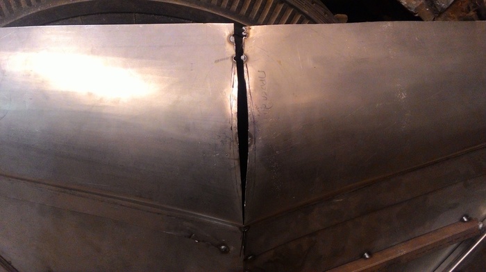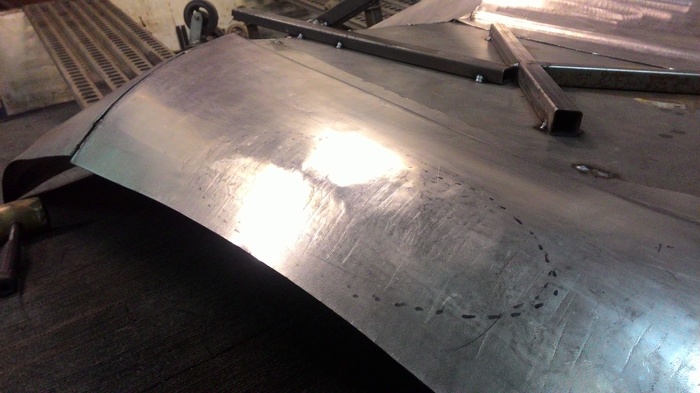 Так же Выяснилась проблема крыши - ее усаживали горелкой и молотками, чтобы она подходила к сплошной рамке, поэтому к моей рамке она не подходила - был провал. Пришлось ее ставить на распорки в пол, чтобы растянуть и приварить. Я рамку лишь прихватил, выставив в размеры, ну а Вадим уже полноценно обварил кроме низа, потому как там нужно изготавливать крышку воздухопритока.