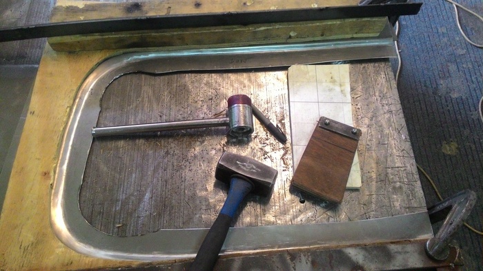 На радиусах оставил внутри поменьше металла, чтобы ему было полегче тянуться. Так же из-за формы заготовки (буквой П) она имеет тенденцию к "раскрытию", поэтому концы "П" нужно надежно держать и постоянно сверять размер. Я понял что заготовка сильно пружинит, и выстукивал при расстоянии между краями на 5мм меньше, чтобы после снятия металл чуть расслабился и раскрылся на эти 5мм.