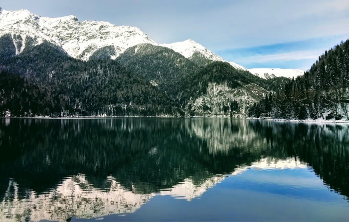 Сама дорога на Рицу, скажу вам, дорогие мои, это отдельная песня, сначала плавно петляющая по правому берегу реки Бзыбь, а после Юпшарского каньона крутой спиралью серпантина ввинчивающаяся прямо в небо. Про ее состояние говорить не буду, ибо не хочу портить огромную бочку рицинского меда маленькой ложкой дорожного дегтя. По пути мы с коллегами по отдыху, мельком заехали на алкопитстоп, но увидев местные цены на вино, от 500 за литр, дружно изъявили желание ехать дальше, оставив нашего драйвера в печали от потерянной им комиссии.