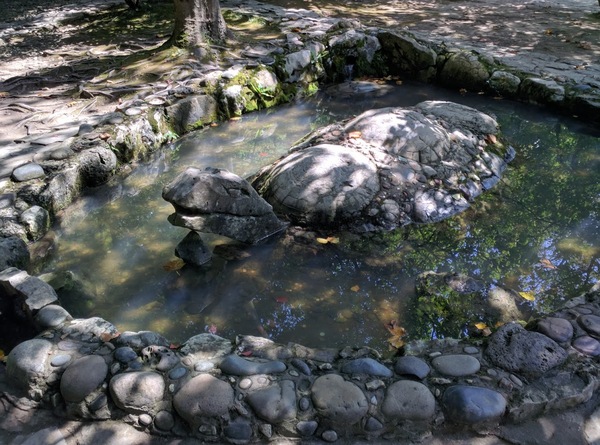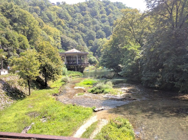 И вот, разместившись у какой-то горной реки, мы пошли пешком к источнику. Дорогу окружали огромные деревья, которым на вид была уже не одна сотня лет, а прям рядом с дорогой спускалась река с ледяной водой, что было очень кстати, т.к. жара стояла неимоверная. Вода в речке, кстати, вполне питьевая и чистая.