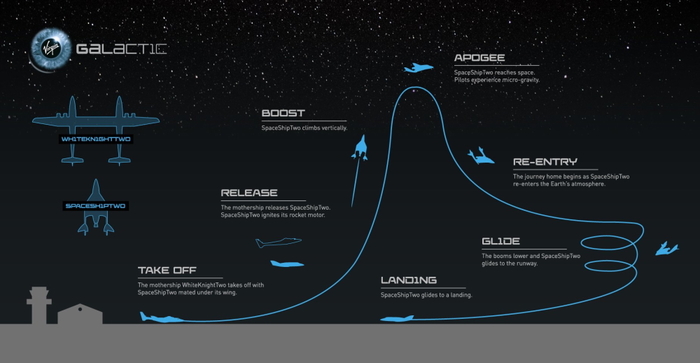 SpaceShipTwo предназначен для полёта с двумя членами экипажа и шестью пассажирами. Он использует свой бортовой ракетный двигатель для подъёма после отделения от White Knight Two. Достигнув апогея, SST разворачивает хвостовую часть, чтобы под нужным углом опустить нос перед входом в атмосферу. Именно из-за ошибки на этом этапе VSS Enterprise потерпел крушение. Эти ошибки были учтены, и во время майского полёта 2021 года всё прошло штатно.