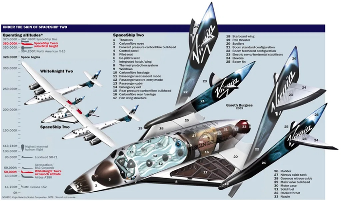 SpaceShipTwo – это космический корабль, который запускается из-под крыла самолёта-носителя. SST использует гибридный ракетный двигатель, чтобы подняться в космос, давая возможность пассажирам ощутить несколько минут невесомости.