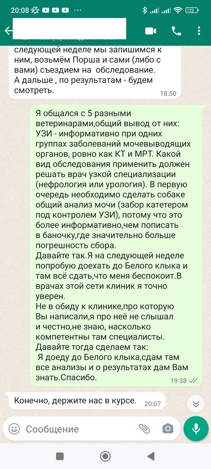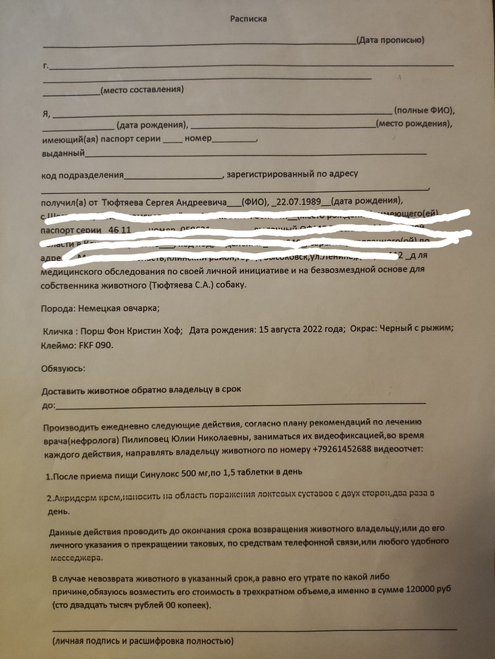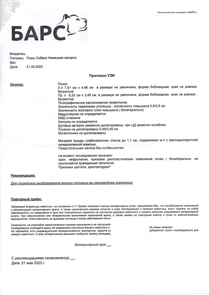 24 февраля 2023 года мною была приобретена немецкая овчарка (кобель, 6 мес.) в питомнике «ФОН КРИСТИН ХОФ». Собаку мне помогала выбирать опытный специалист, в прошлом заводчик. С виду щенок был абсолютно здоров, крепкий и рослый. После приезда домой были замечены некоторые особенности в поведении: большое потребление воды, недержание мочи. Заводчица и знакомые ветеринары объяснили, что щенок рос в вольере и такое может быть, помимо этого в квартире было жарко; а щенок, по моему мнению, живя в вольере не знал, что такое вода. В сутки щенок в среднем выпивал 4 – 5 л. Заводчица была со мной на связи и интересовалась собакой. После отключения отопления и понижения температуры в квартире стало понятно, что жажда собаки не связана с окружающей её температурой. Мною было принято решение сдать анализы и проверить состояние здоровья щенка. 10 мая пришёл результат биохимического и общего анализа крови. Результаты оказались не лучшими, но и не критическими. Написал заводчице и поинтересовался, что делать, если у щенка обнаружатся проблемы со здоровьем. На это заводчица стала рекомендовать сделать УЗИ и анализ мочи, но только в конкретной клинике (Колибри). Мне показалось это подозрительным. Я продолжил сдавать анализы в тех местах, в которых считал нужным. В одной из переписок мною была указана клиника «Белый клык», но, к сожалению, по финансовым причинам попасть туда не смог. Далее последовал анализ мочи от 17 мая. Забор был произведён катетером, чтобы минимизировать погрешность сбора. Анализ оказался тоже не очень хорошим, но и не критичным. После УЗИ и консультации и врача - нефролога стало понятно, что у собаки явные хронические проблемы с почками, в связи с возрастом собаки подобные проблемы могут быть только врожденными. Заводчица категорически не признаёт результатов анализов, отрицает квалификацию выбранных мною специалистов (из разных клиник), настаивает на том, чтобы забрать собаку и в моё отсутствие провести его обследование в той клинике и с теми врачами, с которыми она посчитает необходимым. 22 мая 2023 года я встретился с юристом питомника, по её словам, (у которой забирал собаку, общался и переводил деньги за корм) и впервые встретился с владелицей питомника и предложил им подписать расписку, т.к. они собирались забрать у меня мою собаку, которая является моей собственностью. В расписке я указал их материальною ответственность в случае невозврата животного в договоренный период. Я искренне переживал за собаку, за то, как с ней будут обходиться и будет ли она получать лечение, назначенное врачом – нефрологом, поэтому все эти пункты и указал в расписке. «Юрист» питомника, владелица питомника, а также их водитель не согласились с распиской и зацепились за фразу, что в случае невозврата или утери/смерти собаки в период нахождения у них они обязуются возместить его стоимость в трехкратном размере, а именно 120 000,00. Данная сумма была указана мною из расчёта стоимости собаки, средств, потраченных на корм, лекарств, обследований, а также сил/времени/бензина на поездки по врачам. Вышеуказанные лица не согласились с моими требованиями, и мы были вынуждены расстаться на негативной ноте. Хотелось бы предостеречь от покупки щенков в данном питомнике, в связи с недобросовестностью владельцев питомника, на мой субъективный взгляд. А также, хотелось бы на
