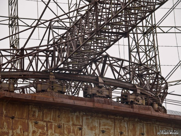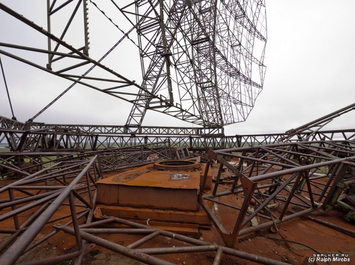 Как видно, в центре поворотного круга царит полный разгром - следствие изъятия кабелей. Кроме того, была повалена небольшая вспомогательная антенна, располагавшаяся с другой стороны главного зеркала. На отдельной штанге в сторону отходит блок антенн-облучателей, включающий в себя как антенны формирования зондирующих импульсов, антенны системы пеленга и запросчика "свой-чужой".