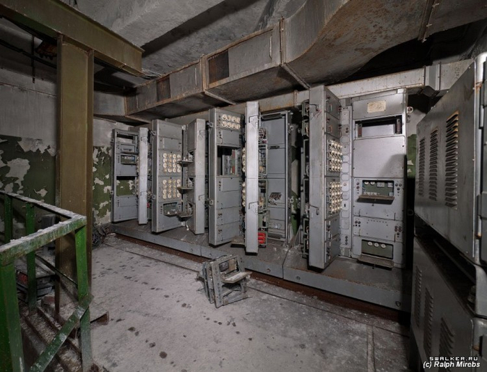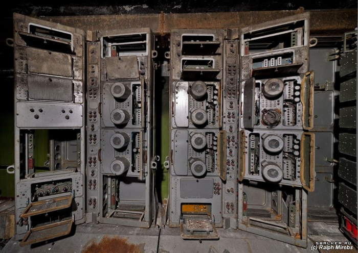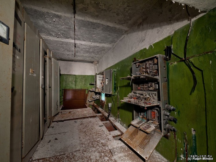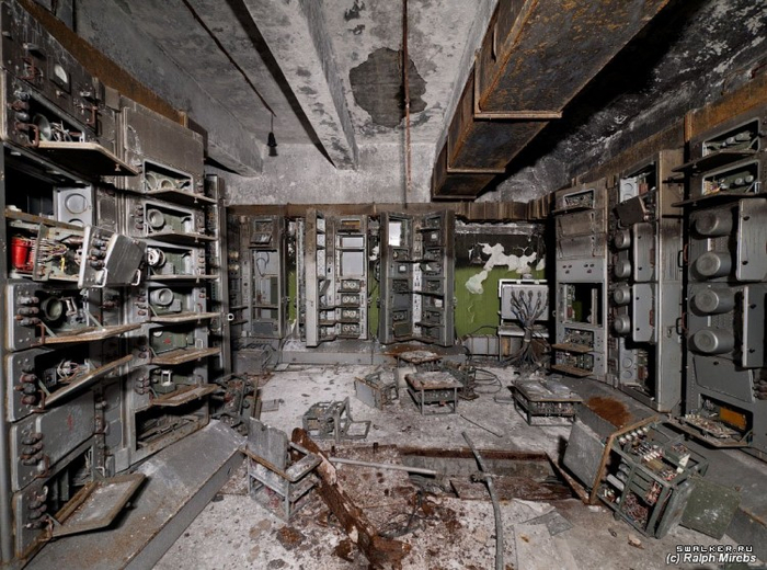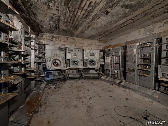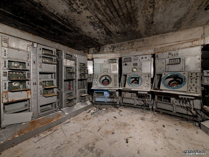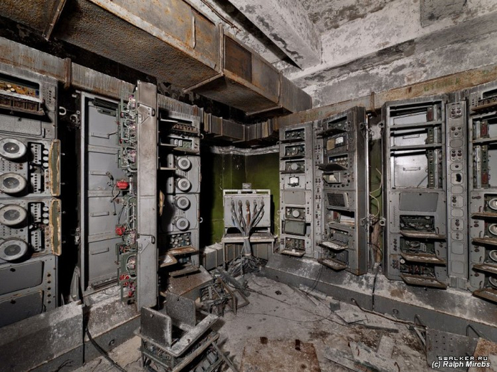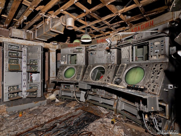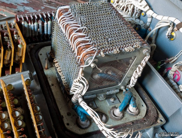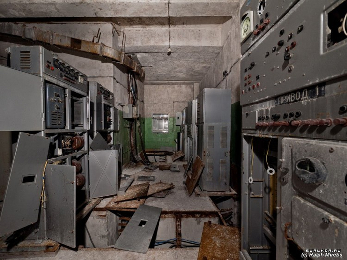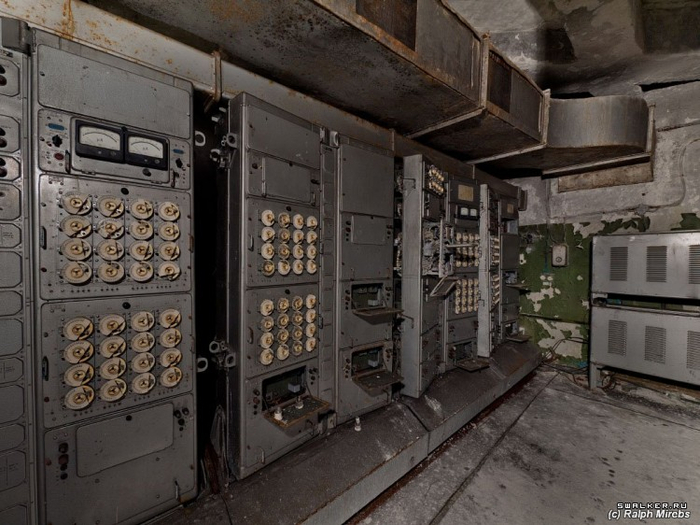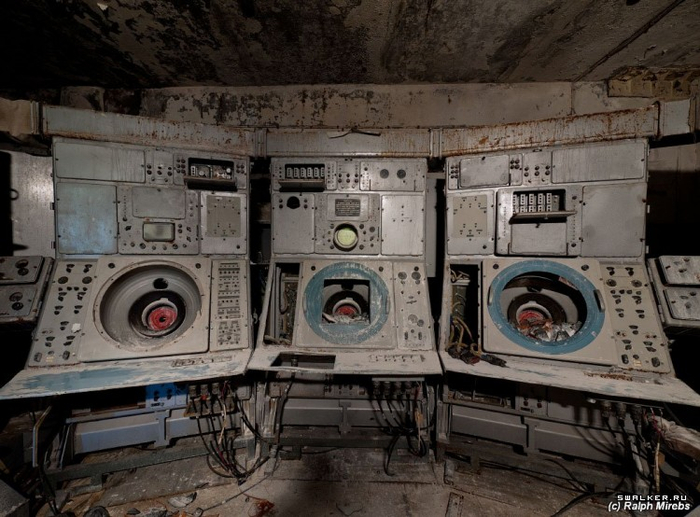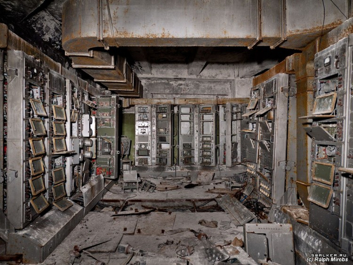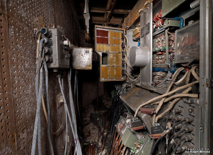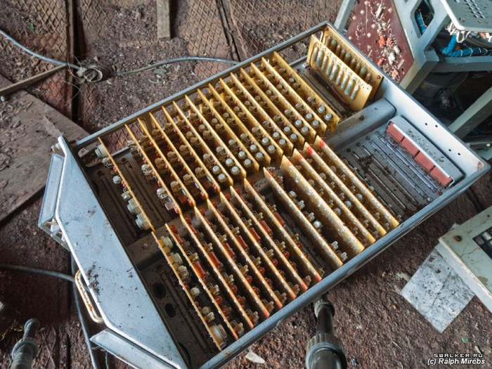 Внутри коробки КП ужасный разгром. Аппаратура повалена, многие экраны разбиты. Всё чёрное от копоти, мокрое и грязное.