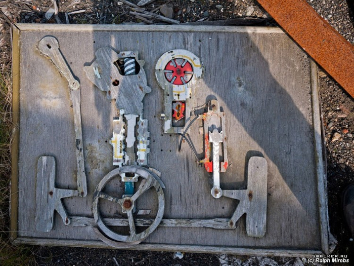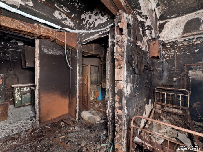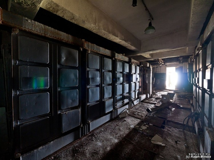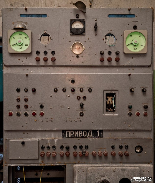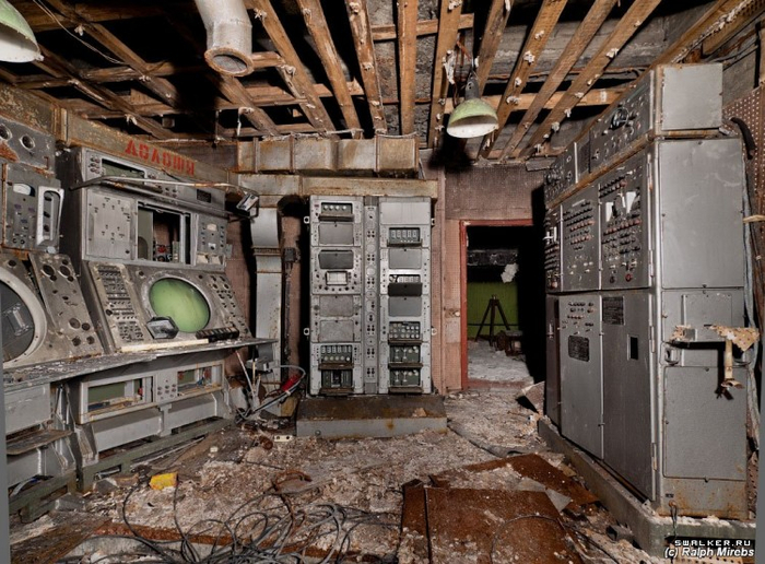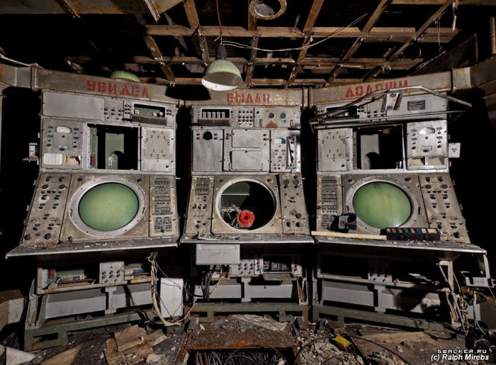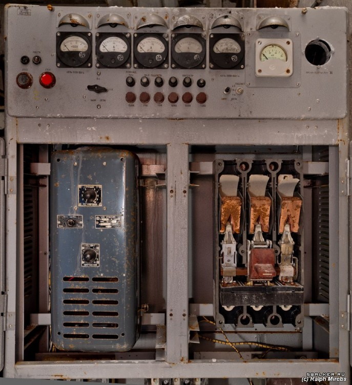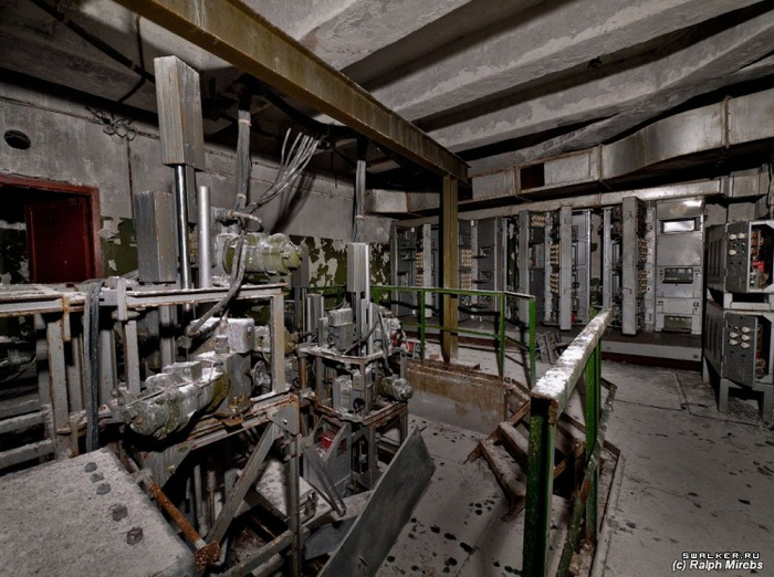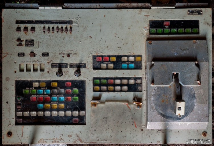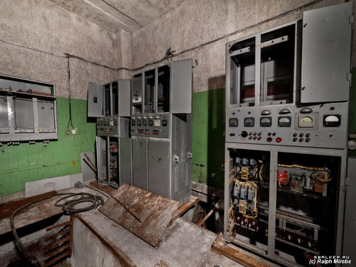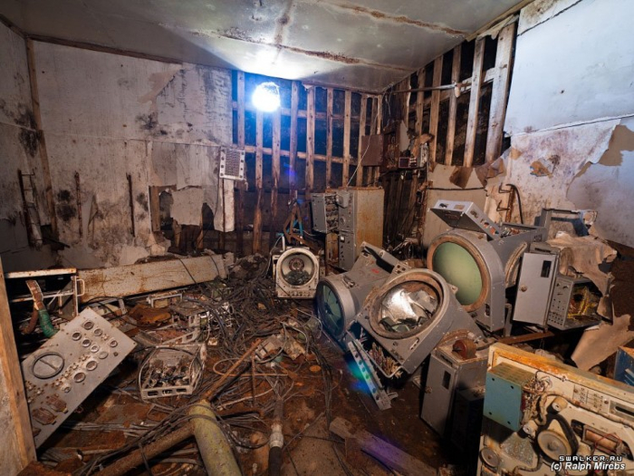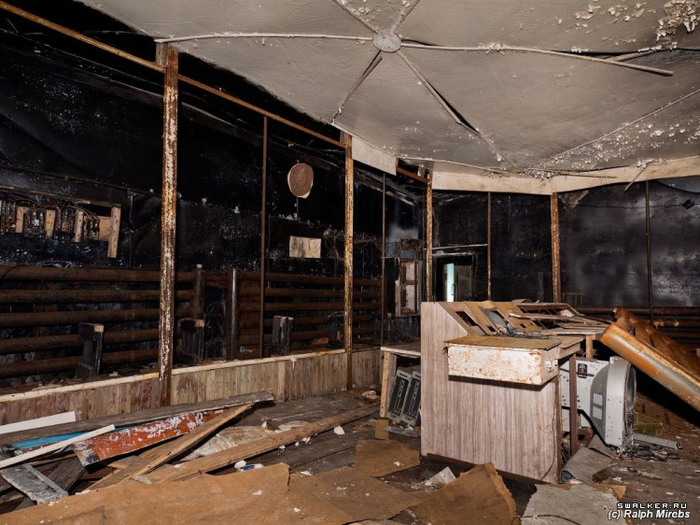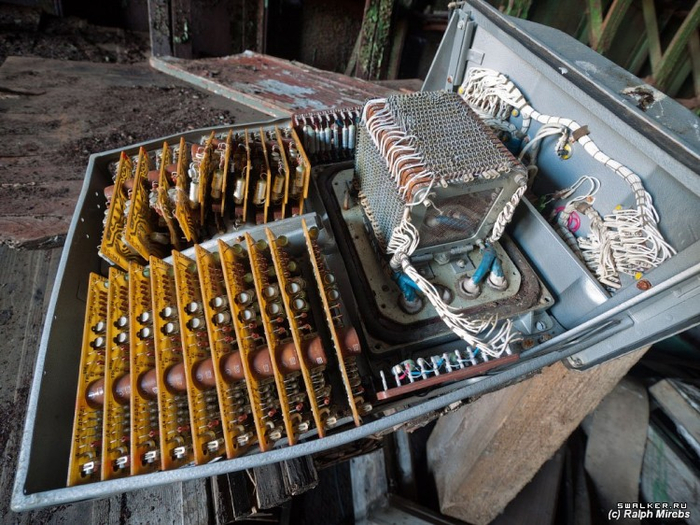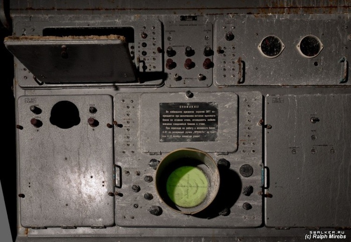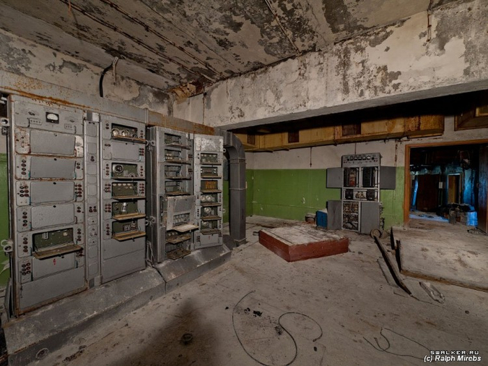 Внутри коробки КП ужасный разгром. Аппаратура повалена, многие экраны разбиты. Всё чёрное от копоти, мокрое и грязное.