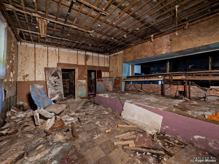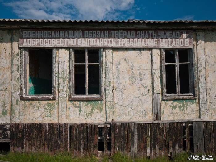Пройдя сквозь ворота с красной звездой попадаем на территорию военного городка, спящего мёртвым сном вот уже почти двадцать лет. Деревянные здания местами порушились, остатки техники разбросаны по округе.