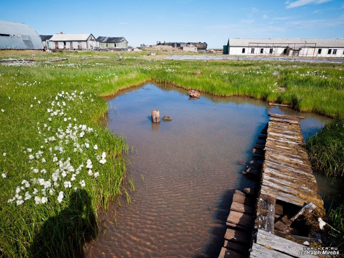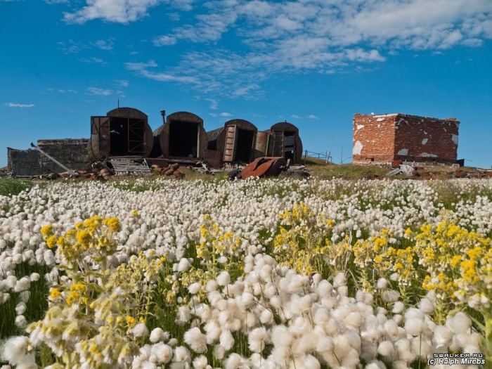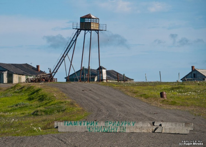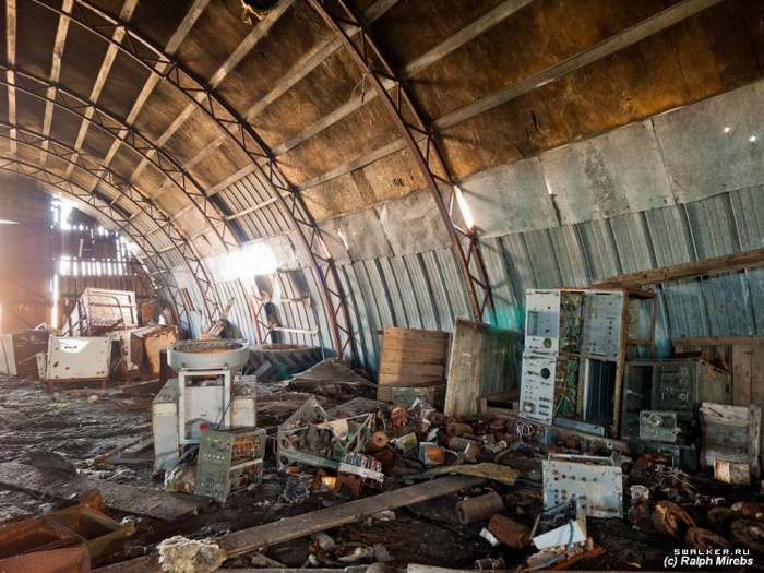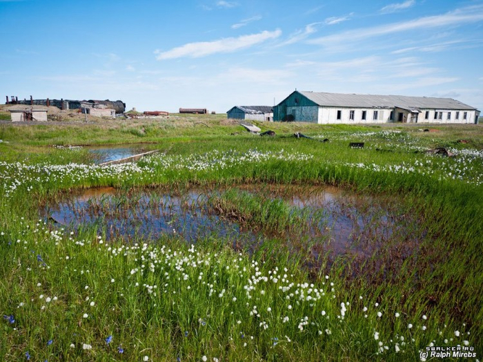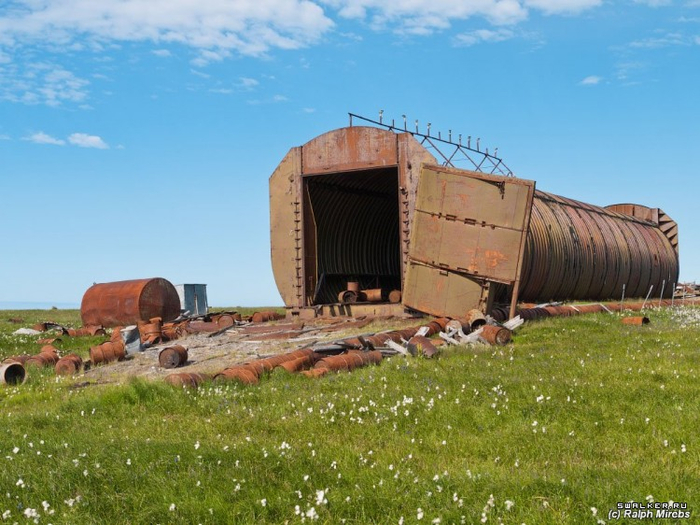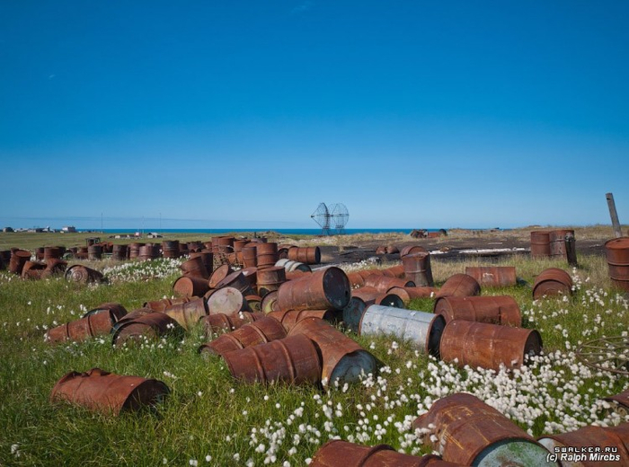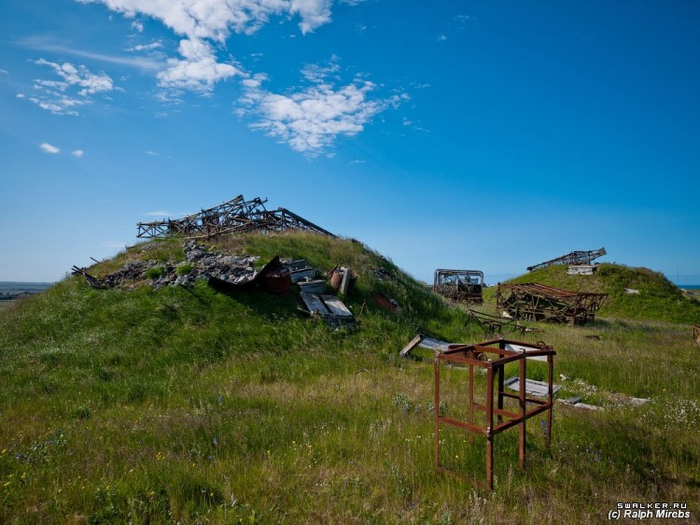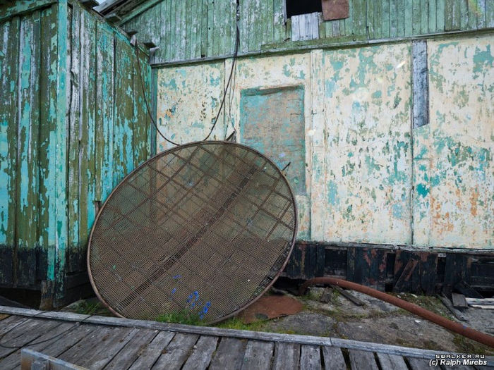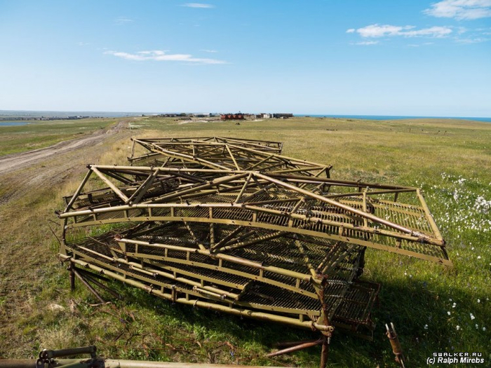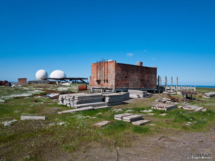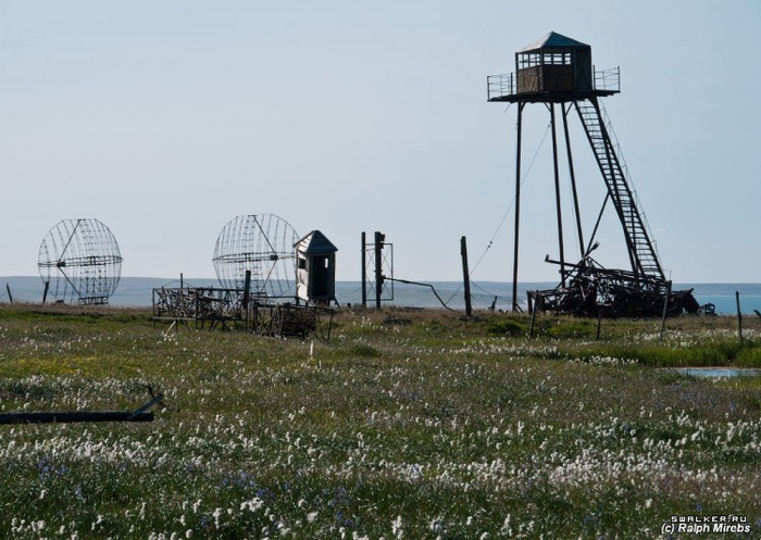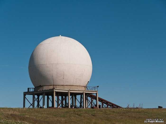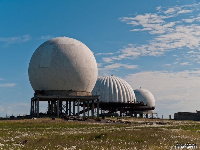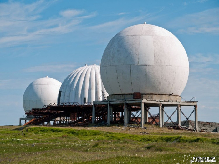 Белые радиопрозрачные укрытия для радиолокационных станций видны с большого расстояния. Когда-то их было четыре, но несколько лет назад один из сегментов оторвали охотники, дабы сделать из него укрытие на время весенней гусиной охоты. Аэродинамика купола нарушилась и бушующие здесь ветра стали проникать внутрь шара, разорвав его на части. С тех пор купола больше не трогали.