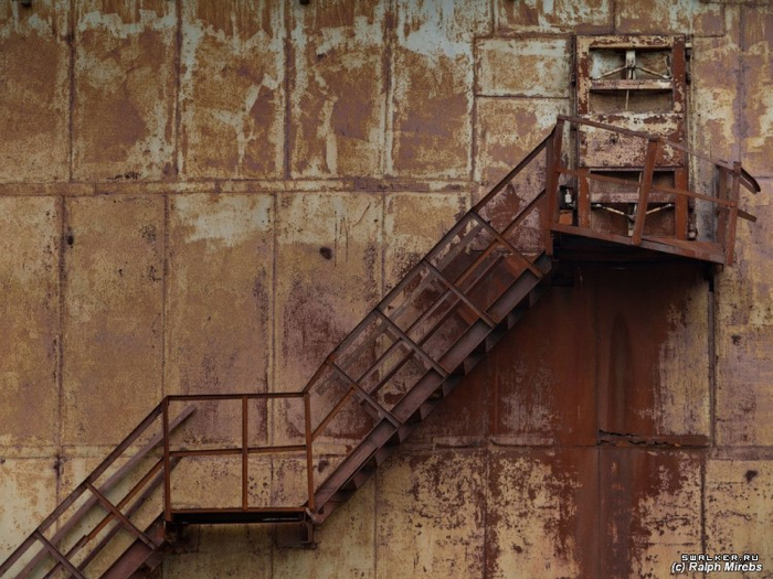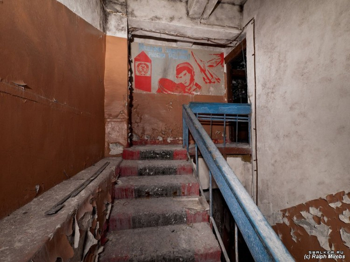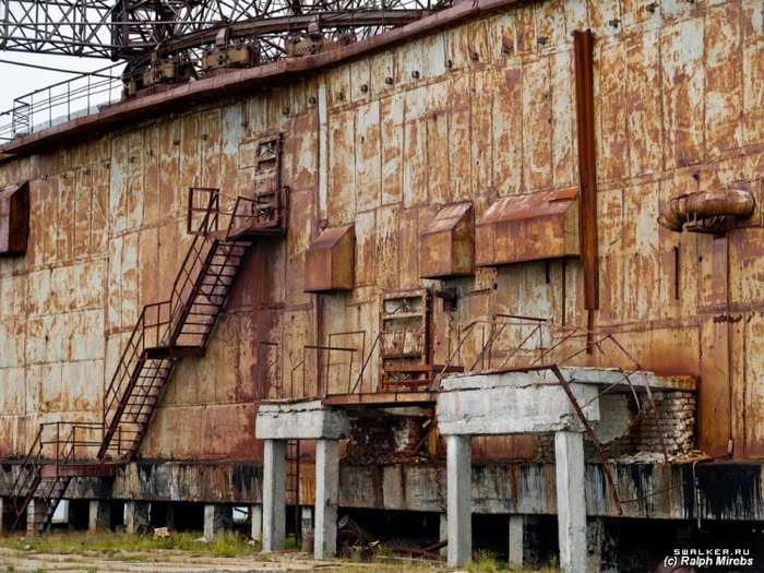 Позади блока высится огромная караульная вышка, а рядом с ней другие уцелевшие антенны.
