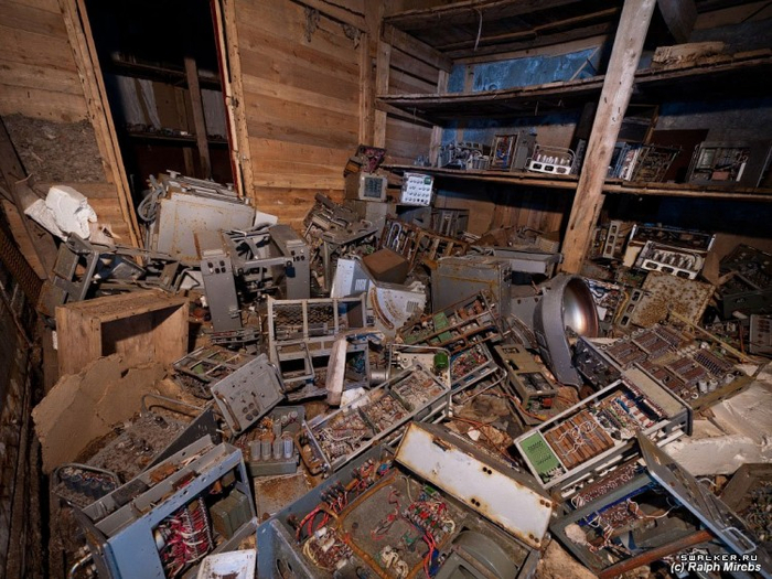 Внутри царит полнейший разгром. Горы электронных блоков перемежаются с разбитыми экранами кругового обзора и аккуратно упакованными запасными частями.