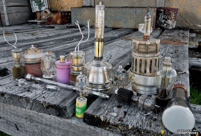 Что же касается радиоламп - то практически все крупные лампы не сохранились (отсутствуют в гнёздах), однако я таки смог найти несколько весьма немаленьких. Кроме того, забегаю вперёд, скажу что на КП местного ПВО был обнаружен целый склад радиоламп. Десятки видов упакованных в картонные коробки.