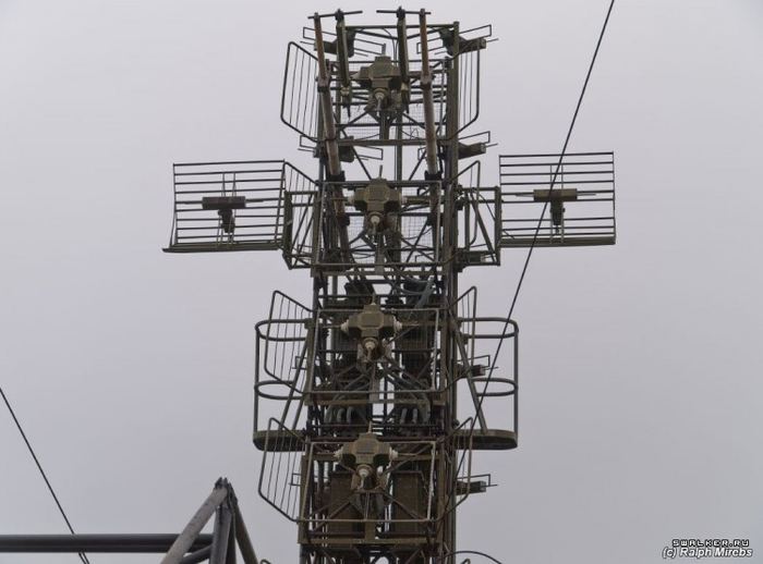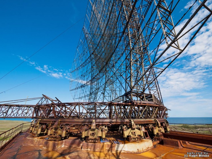 Вылезем на крышу к антенне. Размеры её параболического отражателя 48 на 28 метров, при этом огромная массивная конструкция вращалась по кругу, катаясь на опорных катках. Круглый антенный элемент в центре основного зеркала отдельная антенна систем опознавания "свой-чужой". Вес вращающейся части составлял 42 тонны. Антенна могла вращаться со скоростью 2,5 оборота в минуту при скоростях ветра до 30 м/c или 5 оборотов в минуту при скорости до 20 м/c. Выдерживая постоянный ветер до 50 м/c и наледь до 20 мм, антенна была оборудована системой защиты от гололёда и позволяла (путём пропускания тока 120 вольт через конструкции) за 40 минут растопить лёд толщиной до 5 мм, потребляя при этом 300-350 кВт.