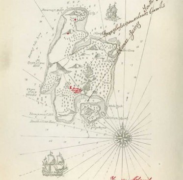 Было так. Вернувшись как-то с прогулки, Стивенсон подошел к мальчику, увлеченно водившему карандашом по листу плотной бумаги. Взглянул – и обомлел: паренек рисовал карту. Минуту-другую Стивенсон стоял молча, затем вытащил из коробки красный карандаш и нарисовал на карте три крестика.