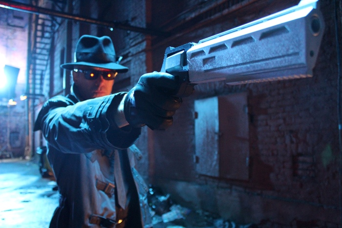 Широкополая шляпа, длинный плащ, бластер (ну или как это называется?) и глаза-лампочки – отличительные особенности Агента (кадр из первого тизера к фильму "Кое-что задаром")