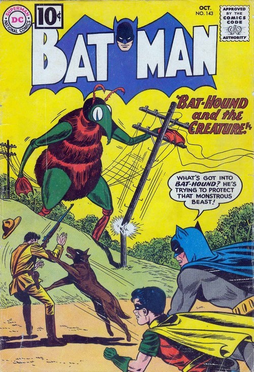Предлагаю перейти к комиксу Batman #143 – вот этому, с исполинским пчелозавром на обложке. Первая история посвящена неуёмной фантазии Робина – Динамический Дуэт ловит небольшую банду, а Робин потом сидит и фантазирует о том, как эту историю будет пересказывать историк из 34 века. Похоже, в его пересказе история обрастёт небылицами в виде крылатого электро-Бэтмэна, который сражается с великаном. Ну так себе. Зато во второй истории Бэтмэн в сражении с «Доктором Пневмо» сильно ударяется головой и временно слепнет. Не растерявшись, он довольно быстро развивает остальные чувства и сооружает особый прибор, обостряющий слух. И привет, Сорвиголова. Что интересно, исцеляется Бэтмэн таким же способом – мощным ударом головой в сражении с Доктором Пневмо. Сильный удар головой – создаст и решит любую проблему.