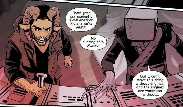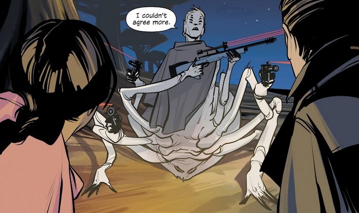 Не дожидаясь, пока отпустит, переходим к комиксу Saga #29. Квейн, капитан Революции, торгуется с главой Венка, он всё ещё хочет обменять Хейзел на заключённых революционеров. Глава Венка в целом не против, но приказывает заодно убить Алану и уничтожить любые свидетельства «мерзкого извращения Марко». Впрочем, настроение генсекретарши Венка резко меняется даже не из-за оскорблений со стороны Клары – она по видеосвязи замечает на борту звездолёта Революции Денго. А Венок ненавидит андроидов. «Пока у вас в компании бездушная машина, сделки не будет». А Квейн такой «Понял, принял». И помощнице «В услугах Денго больше нет нужды, разберись». А Софи, Клеймо со Сладким, Гвен и Лживая Кошка топают к пещере последнего дракона-самца, и да, он там. Застают его в не самое удобное время, он развлекается. Ну как...сам себе отсасывает. Зная особенности комикса «Сага», я почти удивлён, что такое зрелище не состоялось раньше.