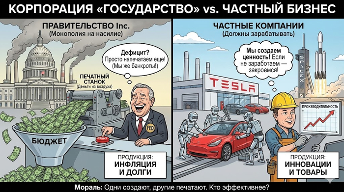 «Правительство — это просто самая большая корпорация с монополией на насилие. Странно, что люди боятся частных компаний, но доверяют государству. Корпорации хотя бы должны зарабатывать деньги, а государство просто печатает их».