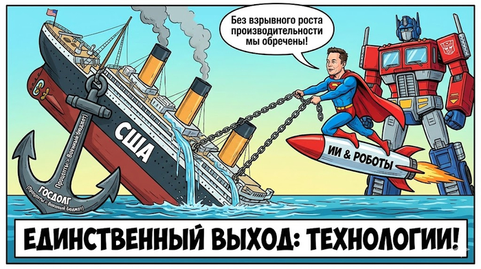 Маск: США идут к банкротству. Проценты по долгу уже превышают военный бюджет. Без ИИ и роботов мы обречены — только взрывной рост производительности может закрыть этот долг.