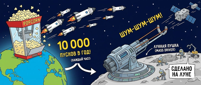«Запуск с Земли ограничен примерно тераваттом в год. Дальше нужно идти на Луну. Построить там электромагнитную катапульту (mass driver). Лунный грунт — это 20% кремния и алюминия. Мы строим заводы на Луне, делаем спутники там и "выстреливаем" их в глубокий космос потоком. Шум-шум-шум — спутники вылетают каждые несколько секунд на скорости 2.5 км/с. Я бы смотрел стрим этого процесса вечно».