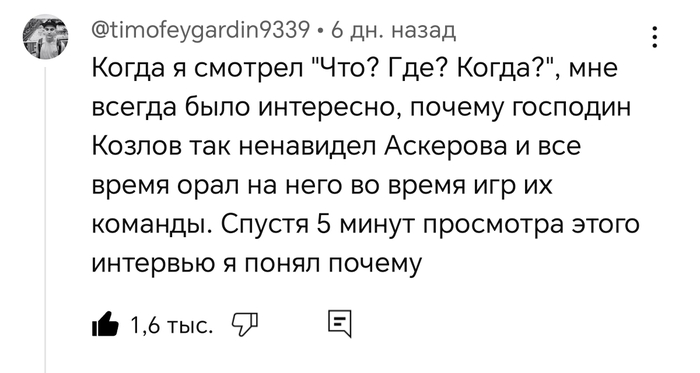 10 лет назад встретила Ровшана Аскерова в антикварном отделе магазина "Москва" на Тверской. Подошла и сказала, что он был моим любимым игроком. Это правда, меня очень заряжала его бешеная энергетика, со школы нравились взрывные интеллектуалы. Обожала наблюдать за ним. И потом, уже в эпоху интернета, пересматривала выпуски с ним.