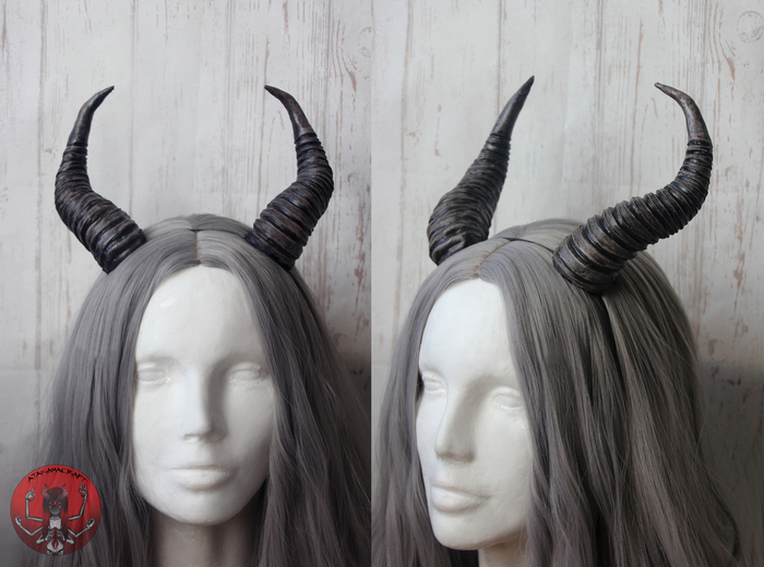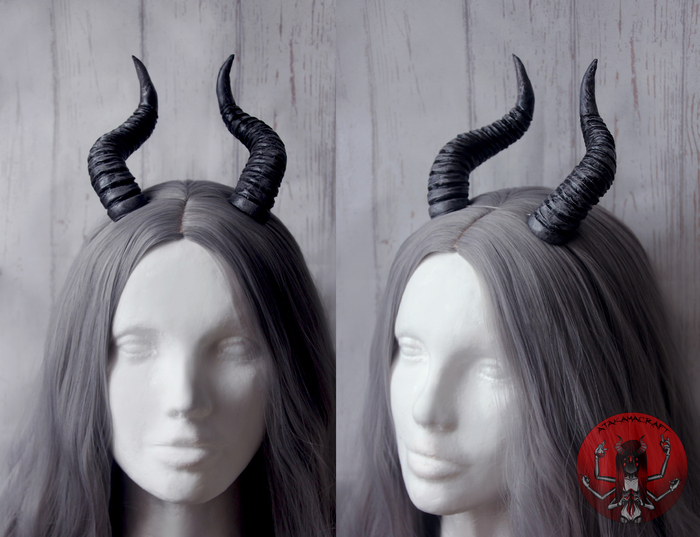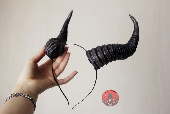 наконец-то покажу здесь свои рожки) они изготовлены из комбинации очень лёгких и прочных материалов по моей технологии, чаще всего использую: металлический каркас (проволока и фольга), 2 вида термопласта и бархатный пластик, покрас акрилом и покрытие защитным водостойким лаком