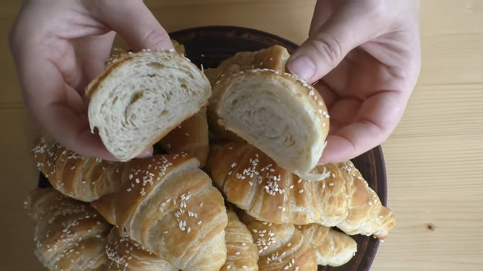 Рогалики выложить на противень, застеленный пергаментом, смазать