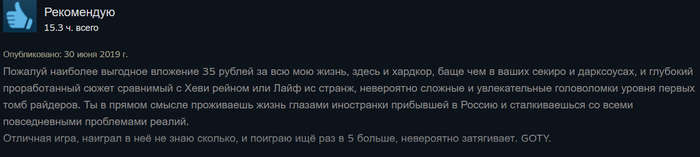 Тем не менее я доволен тем что вышло. Получилось небольшое приключение на 6-8 часов, местами всратенькое, но с "душой" + уважаемые 92% положительных отзывов (хоть и всего из 64 и штук 10 из них от так или иначе моих знакомых). Иногда, что бы поднять себе настроение я открываю отзывы к PUT ANNA и на душе становится тепло (хоть на долго этого всё равно не хватает, но хоть что-то)
