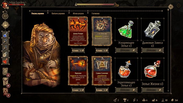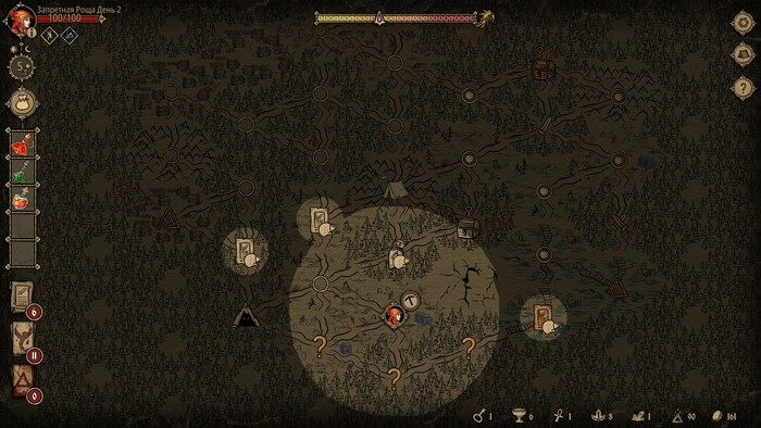Выходя из лагеря, мы оказываемся на карте конкретного уровня, по которой разбросаны ресурсы, сундуки, точки боёв и т.п. Переход с одной точки интереса на другую осуществляется в пошаговом режиме и занимает час игрового времени. Это важно, потому как ассортимент у торговцев обновляется раз в игровые сутки, а также потому, что спустя некоторое количество времени мы принудительно отправляемся в лагерь, а после – на боссфайт.