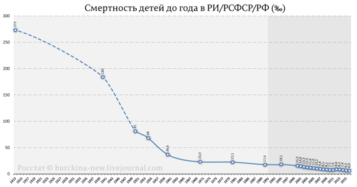 Этот показатель рассчитывается как число умерших детей возрастом до 1 года на 1000 родившихся. Вот данные по годам за последние несколько эпох.