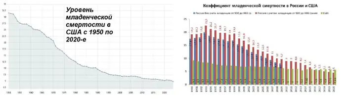 Что такое ад советских родильных домов и крайне низкий уровень советской медицины? Два факта для понимания: в 1932 показатель был 233, в 1991 показатель был 17,4 погибших младенца из 1000 рожденных. Снижение было значительным, но даже в последний год СССР показатель младенческой смертности был крайне высок. В 1995 показатель составил 18,1 — незначительное повышение во время значительных перемен в стране. В 2024 младенческая смертность в России достигла исторического минимума и составила 4 случая на 1000 родившихся живыми.