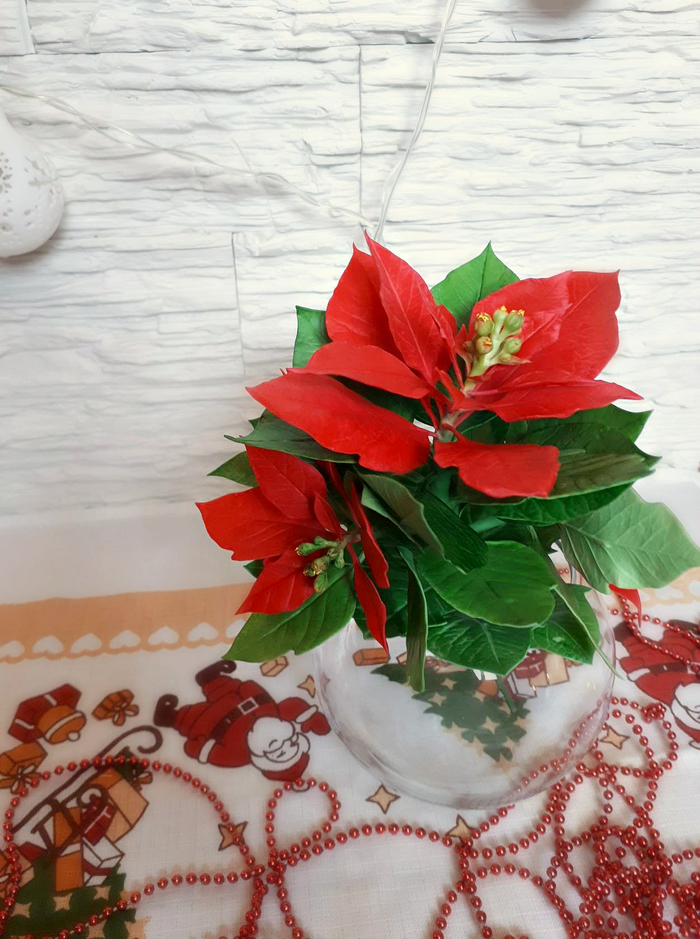 Все это приятная суета и мне работы прибавилось,заказы все более на новогоднюю тематику,мандаринки в украшениях,елочные шары, украшенные цветами и разные композиции для дома.Вот один из последних заказов рождественская звезда(пуансетия). Слеплена из холодного фарфора,тонировка маслом и пастелью.Собрана в виде ветки с тремя соцветиями,если правильно их так назвать,красную верхушку,звездочку.Можно поставить в вазу,создать композицию,добавив всяческие безделушки типа гирлянда,мишура,бусы,иней,блестки ,много свечек,шишек вокруг и т.д. и т.п. на сколько фантазии хватит))Ну а данная веточка сделана для "посадки"в кашпо.Высота 18 см.,диаметр 15