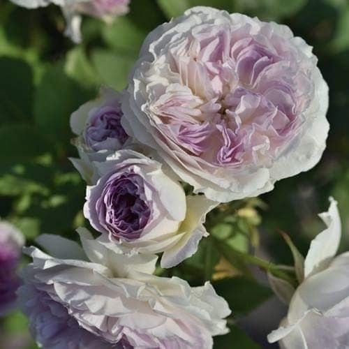 2. Blue Moon Stone (голубой лунный камень, 2018). Свободное расположение лепестков, густомахровая роза с пуговкой в центре цветка. Есть легкий аромат. Категория голубые розы, внешние лепестки белые.