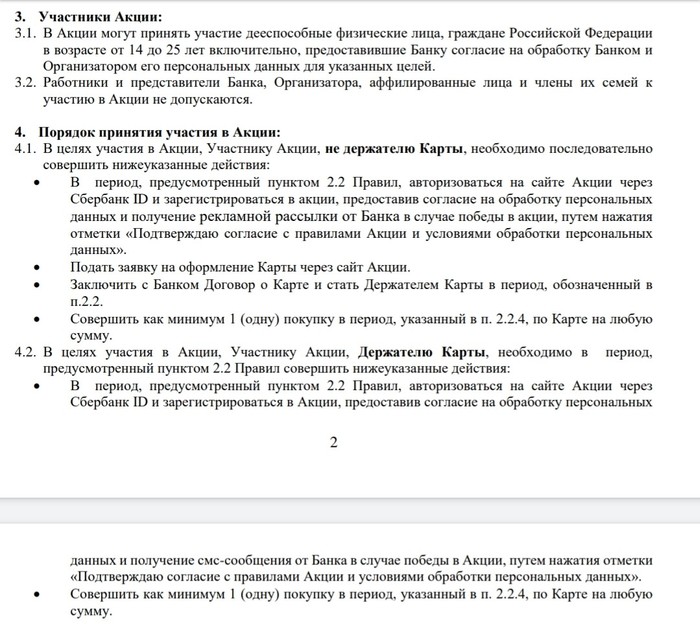 Весь срок акции разбит на десять этапов. Это удобно для Сбера, люди могут каждую неделю тратить три раза по 1000 руб. и ещё раз принимать участие в розыгрыше. Для людей это не очень удобно - гораздо удобнее потратить 3000 руб. один раз, а не каждую неделю. Но есть нюанс - если хочешь выиграть деньги нужно потратить три раза по 1000 руб. за одну неделю (п. 4.2 Правил), а не за весь срок действия Акции. А чего вы ожидали? Как и написано выше (это факт, а не выдуманный бред), цель любой стимулирующей акции - получение прибыли со всеми вытекающими, это НЕ может являться минусом, так как с подобным вы столкнетесь в любом розыгрыше. Никто не обязывает вас что-то тратить, вы делаете это как обычно и доплаты за "участие" в розыгрыше не происходит. Это написано даже в самих правилах