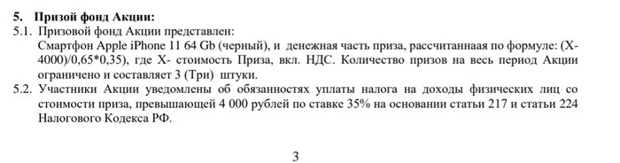 Призом является смартфон iPhone 11 64Гб Black + процент от стоимости телефона для уплаты налога за выигрыш (35% очешуеть)