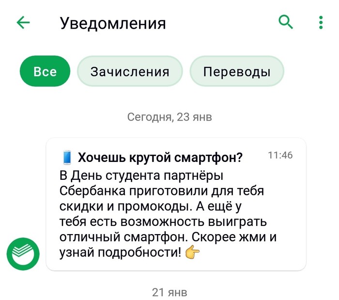 Сидел сегодня на лекции и тут мне пришло уведомление от приложения Сбербанка о акции в честь дня студента.