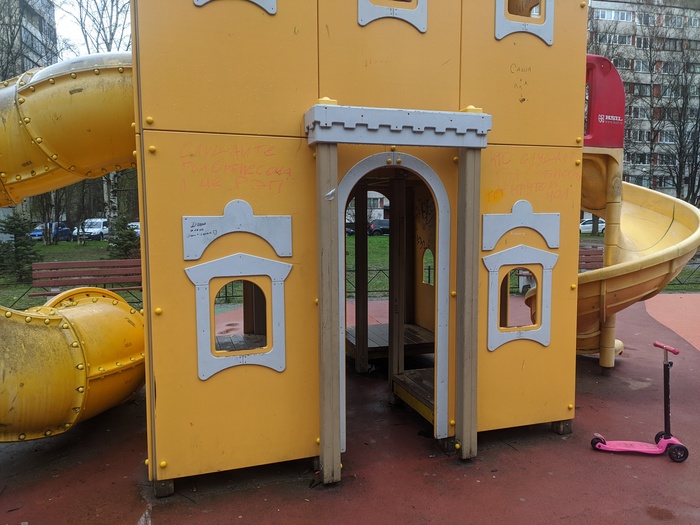 Гулял с сыном на детской площадке. Вся завандалена (с другой стороны) тажками графитчиков.