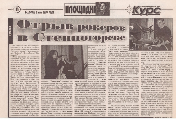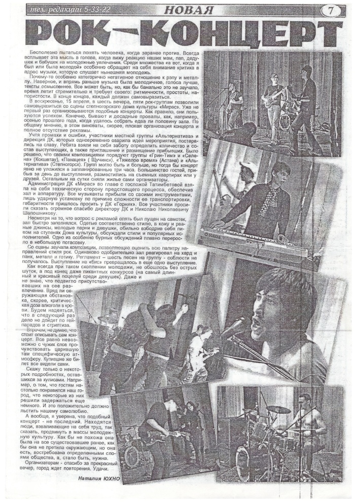 Как и в Щучинске, к местному ДК начал стекаться народ, о котором даже черканули несколько заметок местные журналисты, уж очень они были под впечатлением разнузданного вида музыкантов и их фанатов. Остался час до начала концерта, а нашего басиста было не видать… Мы начали паниковать и злиться. Наконец, как ни в чем не бывало, он приехал с панками из Кокшетау. Мы выдохнули.