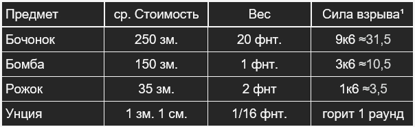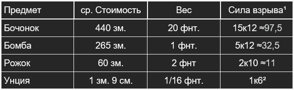Скорее всего, вы, как и я, задались вопросом: “Как бомба, вес которой в 2 раза меньше рожка, при взрыве наносит в 3 раза больше урона?”, официального ответа на него нет, но я предположу, что в составе бомбы, помимо самого пороха, есть ещё и некие осколки, так это похоже на подобие гранаты, поэтому и цена столь не низкая, так как в отличие от бочонка, бомбу может кинуть любой персонаж на дистанцию 20/60 футов.