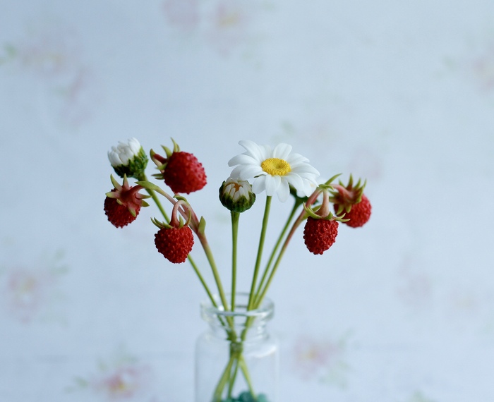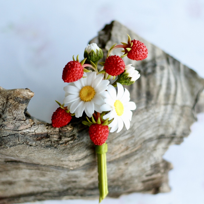 Для ягод земляники использовала молд, так как вручную такую фактуру конечно не сделать. Стебельки обкатала полимеркой. Ромашки, как сделала, показывала в предыдущем посте.