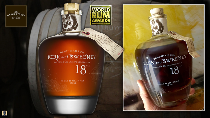 Этот ром из Доминиканской Республики импортируется компанией из США 35 Maple Street Spirits (Калифорния). Он перегоняется из свежего сахарного тростника и выдерживается не менее 18 лет в бочках из-под бурбона и французского дуба. Название Kirk and Sweeney происходит от названия шхуны, которое во времена сухого закона, занималась контрабандой. На этикетке отображен ее маршрут, если кому интересно. Большая часть рома выдерживается по системе солера, что означает, что в нем есть и более старые спирты. В результате получается ром темно-янтарного цвета с нотками хереса, изюма, ванили и дуба во вкусе.